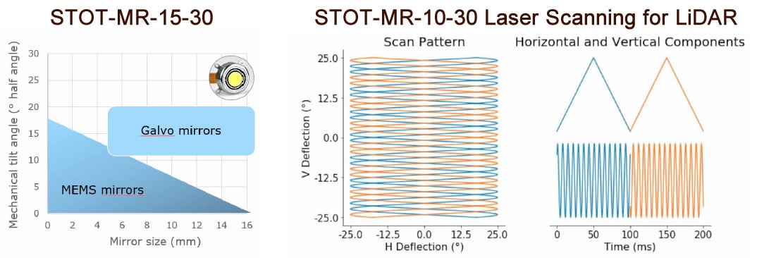 如果需要小体积与大角度视野的双轴扫描镜,STOT-MR-15-30会是绝佳的选择。STOT-MR-15-30最小直径可达15 mm、机械倾斜角度±25°,同时对应光学偏转±50°。此镜片内建有一个位置反馈系统,使用标准PID控制器在100mrad范围内可精确控制偏转角度在±5 μrad内。除了常见的准静态版本,我们还开发两种共振的版本,即单轴共振镜头、线性轴加垂直共振轴结合的版本。与扫描振镜相比,STOT-MR-15-30的旋转原点非常靠近镜面中心,另可选用不同范围波长的反射膜,如紫外线、可见光与近红外光。