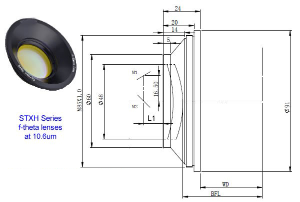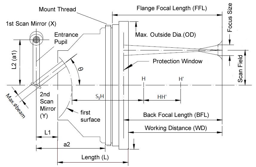 场镜通常由三个镜片和一个保护玻璃所组成,在指定波长或光谱范围镀膜。在1064nm波长时的透过率 > 99% ,保护玻璃也会在两面镀膜。在下面的表格中,FL 表示有效焦距,EP是最大输入光斑直径,SAR是扫描面积,AS是截止口径aperture stop,WD是工作距,OD是场镜外径,MT是安装螺纹,fs是材料熔融石英,SA是最大扫描区域对角线,L2 (a1)是两个扫描镜片间距,L1是第二个扫描镜片和场镜的距离,SL是扫描长度,长度(L)是场镜的长度(高度),FSD是焦斑直径,WC是水冷。