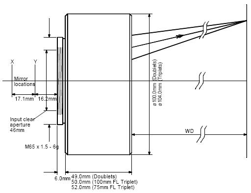 | 型号 | FL mm | WD mm | EP mm | 扫描角 θmax | 扫描面积 mm | 焦斑 ?m | OD mm | 安装螺纹 |