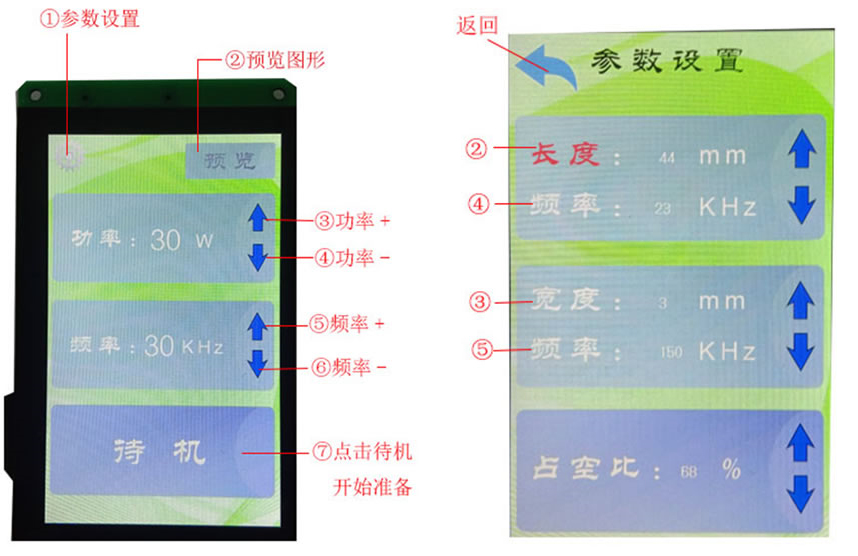 软件软件可以设置激光功率、脉冲重复率、脉冲占空比,也可以分别设置X方向和Y方向的扫描长度和激光频率。