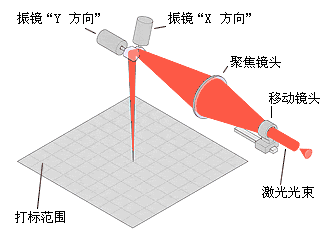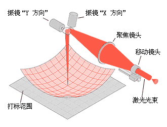 在前聚焦扫描振镜工作时,激光束首先进入移动镜头。通过移动镜头之后,光束快速分散,接着进入一个或两个聚焦镜头。会聚的光束穿过镜头,并由一组 X 和 Y 镜片(这些镜片由振镜式扫描器移动)引导。X 和 Y 镜片呈直角排列,向下引导光束,覆盖工作范围的长和宽。