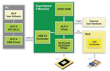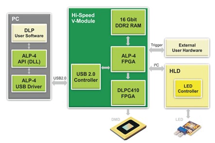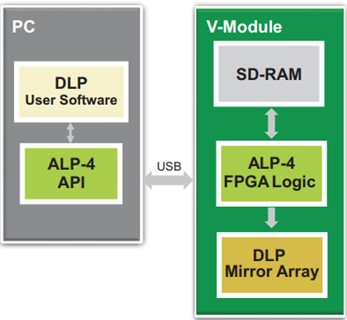 ALP-4控制器套件是一个通用平台,可实现DLP微镜的高级控制系统。为工业、医学、研究和开发而设计的一套广泛的库功能为应用程序开发提供了便利。我们推出了第一个ALP控制器套件TM,从2001年TI在市场上推出的第一个DLP Discovery芯片组开始。多年来,基于FPGA的DLP芯片组一直得到支持,保持了应用程序编程接口的完全兼容性。使用ALP-4的客户可以快速启动产品设计,而无需耗时开发软件、固件和高频FPGA逻辑代码。控制和数据流的方案如下面的框图(下图左)所示。操作原理与标准多媒体投影完全不同。图案序列在PC中生成,并通过压缩的USB传输上传到板载存储器。高度复杂的FPGA逻辑用于处理数据并将数据流传输到微镜阵列。ALP-4控制器套件包含在所有V模块中,如图(下图右)所示。它也可作为德州仪器DLP Discovery4100评估模块(EVM)的附件提供。