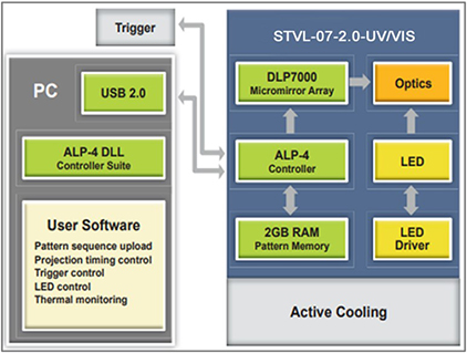 STVL-07-2.0-RGB的中央控制单元通过USB 2.0连接,实现图案上传、显示和同步。集成触发设施在其光耦接口支持宽电压范围,并且是软件可编程的。LED光源的数字驱动器可方便地访问电源设置和温度读数,以进行热管理。